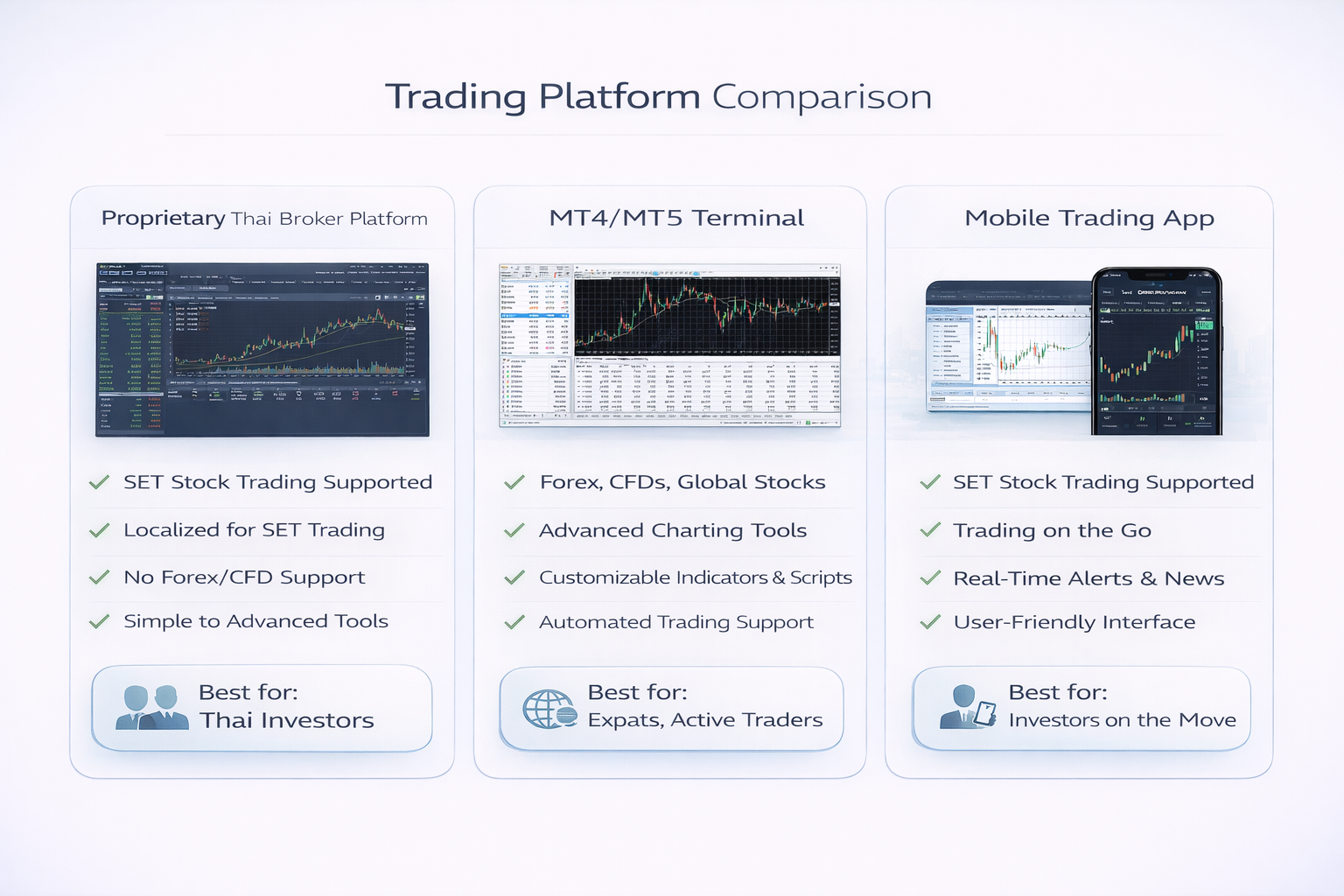 - Thai brokers: Custom web and mobile apps with Thai interface, SET order types, real‑time quotes.