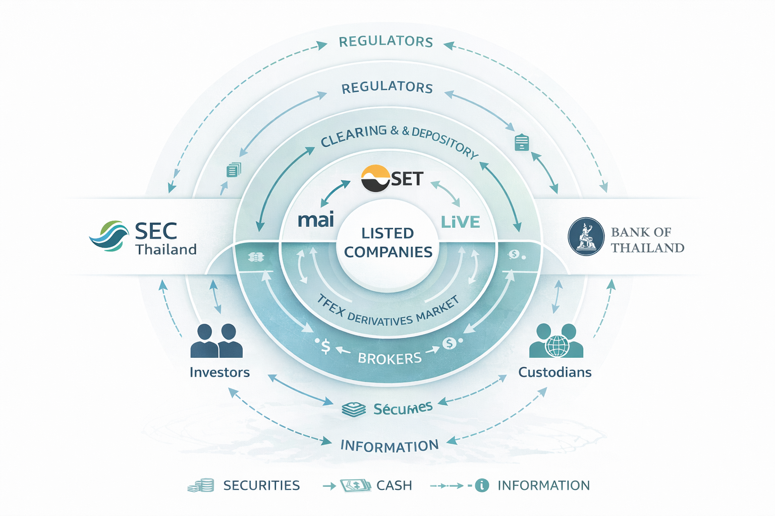 Thailand’s capital market is a multi‑layered ecosystem centered on the SET Group, which includes the SET, mai, TFEX, TSD, and TCH, alongside the SEC, BOT, clearing banks, custodians, and brokers.