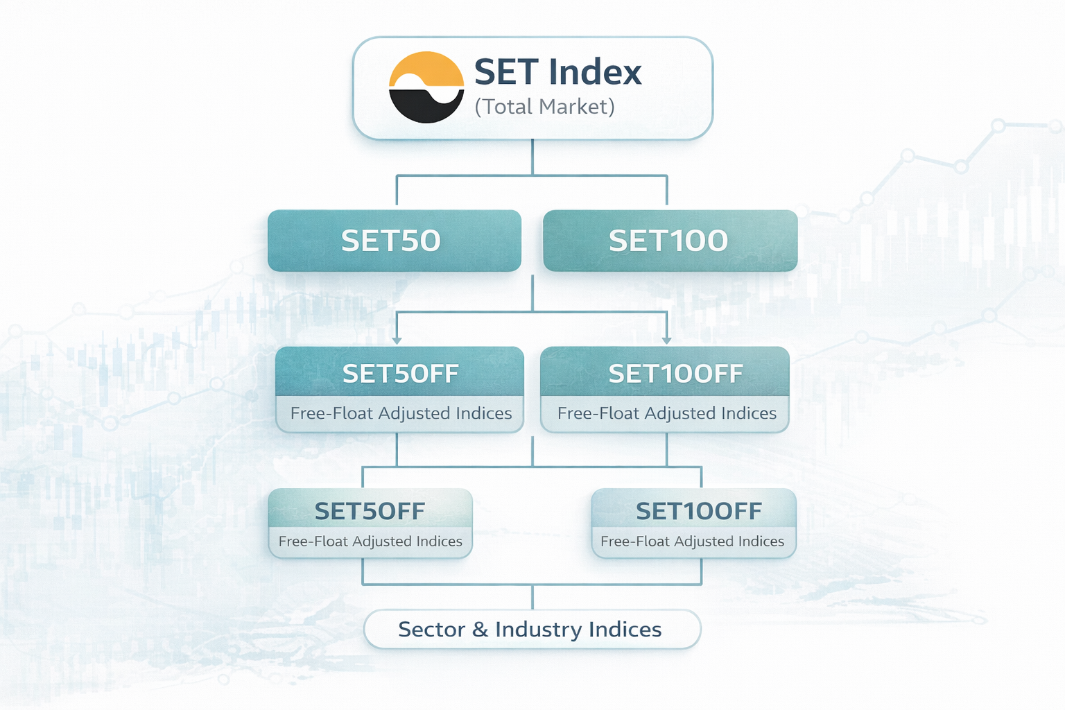 - SET50: Market‑cap‑weighted index of the top 50 companies by market value and liquidity, used as the underlying for index futures and options.