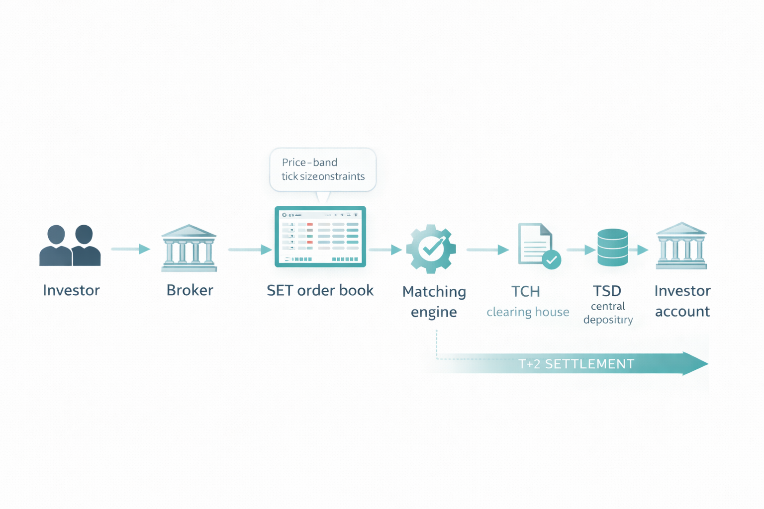 Thailand’s equity market is a fully electronic, order‑driven system with standardized sessions, auction mechanisms, tick rules, and T+2 settlement.